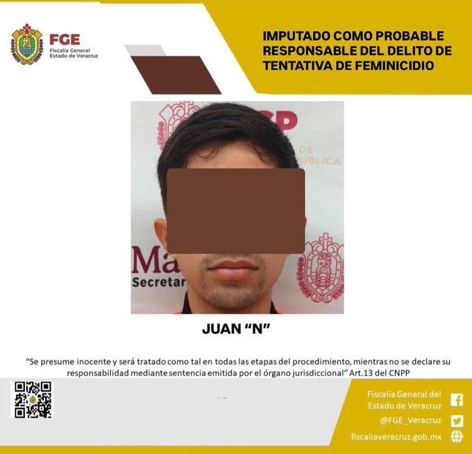 La Fiscalía General del Estado (FGE) informó mediante un comunicado la imputación como probable responsable del delito de tentativa de feminicidio contra Juan "N", quien fue detenido la tarde del pasado viernes 1 de Agosto, en Córdoba, en la región centro de Veracruz por elementos de la policía ministerial. El sujeto es señalado por agredir a una mujer embarazada.