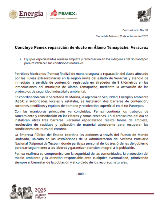 Petróleos Mexicanos (Pemex) informa que su personal concluyó la reparación del ducto afectado por las lluvias que ocasionó un derrame de hidrocarburo sobre el río Pantepec, en el municipio de Álamo Temapache, tras las inundaciones en Veracruz.